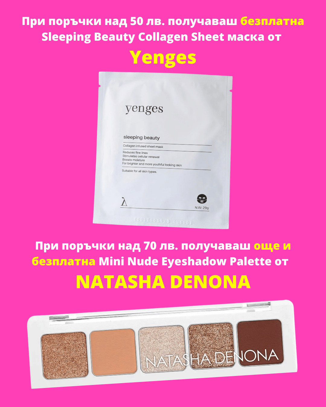 При поръчки за лимитирани издания над 50 лв. получаваш безплатна Sleeping Beauty Collagen Sheet маска от Yenges, а при поръчки над 70 лв. за лимитирани издания, получаваш и още един безплатен продукт -Mini Nude Eyeshadow Palette от Natasha Denona.